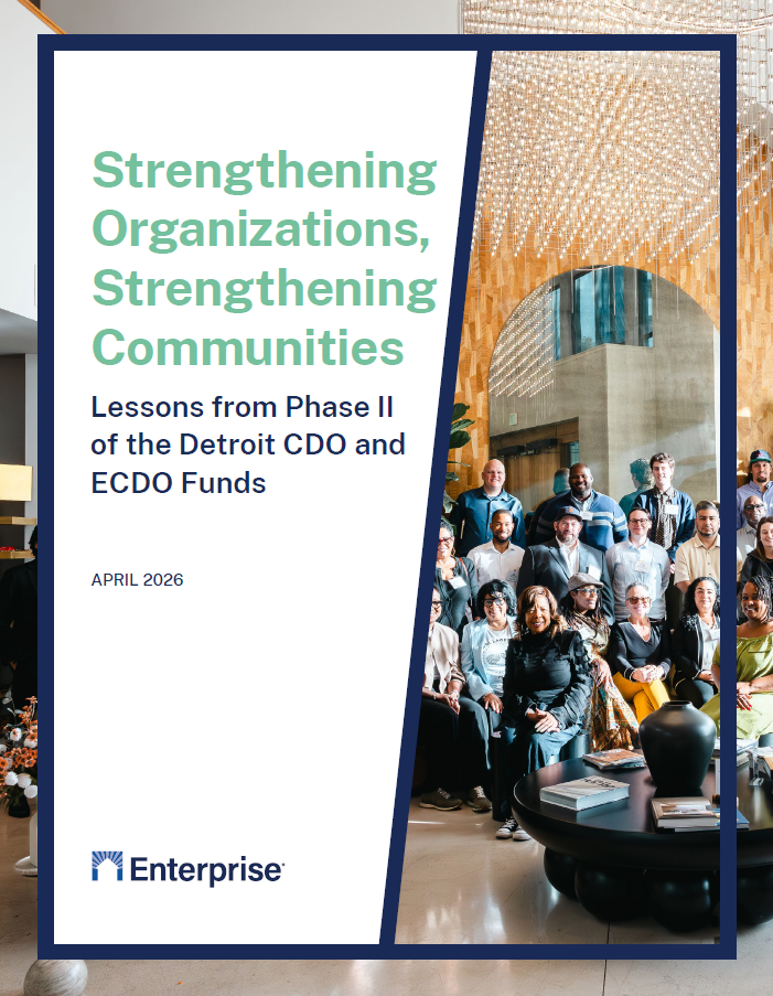 In this report, Enterprise summarizes findings from Phase II of the CDO and ECDO Funds, which provided continued support to 32 community-based organizations working in Detroit. Using a mixed-methods evaluation, the report explores how these funds helped organizations diversify revenue, build capacity, and scale their impact through housing development, community services, and cross-sector partnerships. Findings show that 97% of grantees secured new sources of revenue, and grantees collectively contributed to the creation or preservation of more than 1,400 affordable homes and delivered services to over 100,000 residents. The report also outlines key lessons for funders and practitioners on sustaining community development organizations and strengthening local ecosystems through collaborative, flexible funding models.